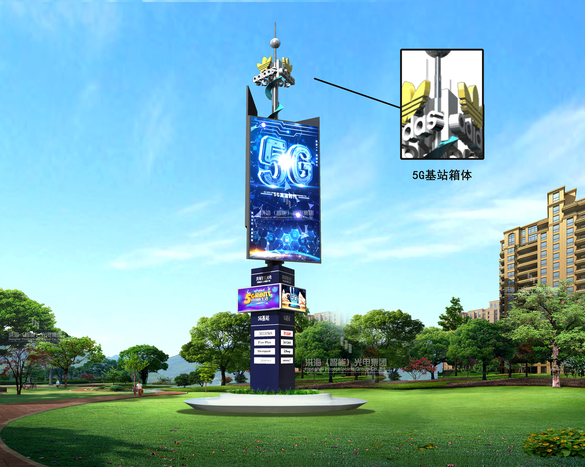 (2)洪海5G智慧燈桿螺旋旋轉(zhuǎn)屏同時(shí)也是亮化工程的組成部分