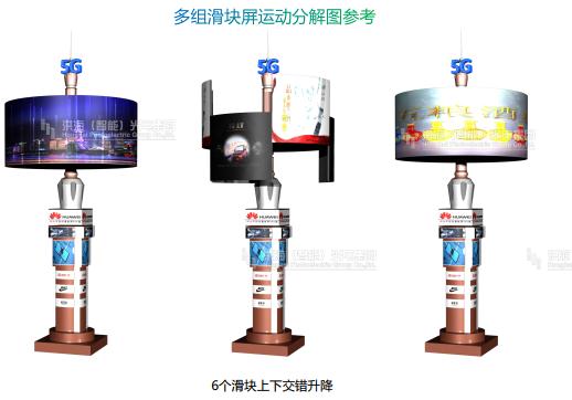 多組滑塊升降屏可以360度旋轉,一共6LED模組屏,每個模組屏可以獨立播放視頻,上下錯落的自由升降,也可以合并成一塊圓柱大屏,變化多樣用途廣泛,成為獨特搶眼的地標。